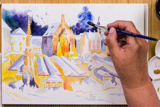 Ebben a hírben lépésről-lépésre bemutatjuk, hogyan készíthetünk karácsonyi hangulatú képet vízfestékkel Nürnberg városáról. Nürnberg a hangulatos karácsonyi vásáráról és történelmi óvárosáról ismert. Az elkészített kép akár a házilag készített karácsonyi üdvözlőlapokhoz is tökéletes lehet.