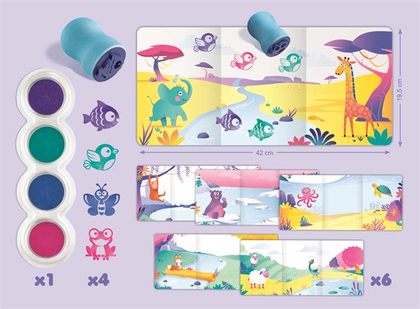 A 6 különböző foglalkoztatólap segítségével játékos módon fejlődhet a gyerekek kézügyessége és képzelőereje. A készlet minden szükséges eszközt tartalmaz az önfeledt szórakozáshoz. Válaszd a madár, béka, hal vagy pillangós nyomdát, mártsd bele a kiválasztott színű tintába és kezdődhet is a móka! A nyomdák tökéletesen illeszkednek az apró kezekbe, így a gyerekek egy könnyed mozdulattal dekorálhatják ki a foglalkoztató lapokat.