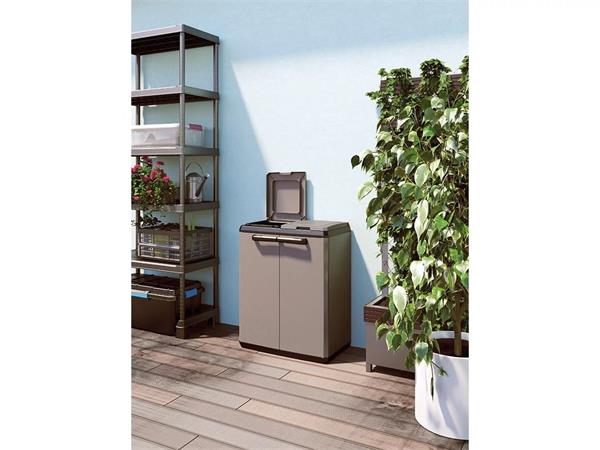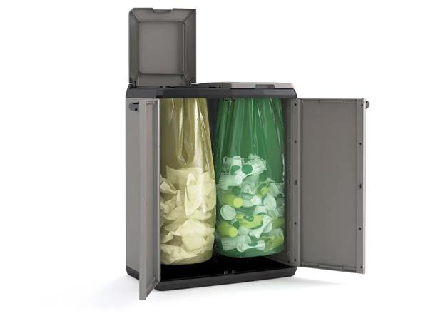 A KETER Split szelektív hulladékgyűjtő szekrény intelligens kialakításának és modern, sötétszürke/fekete megjelenésének köszönhetően stílusosan és egyszerűen tesz a környezet védelméért.